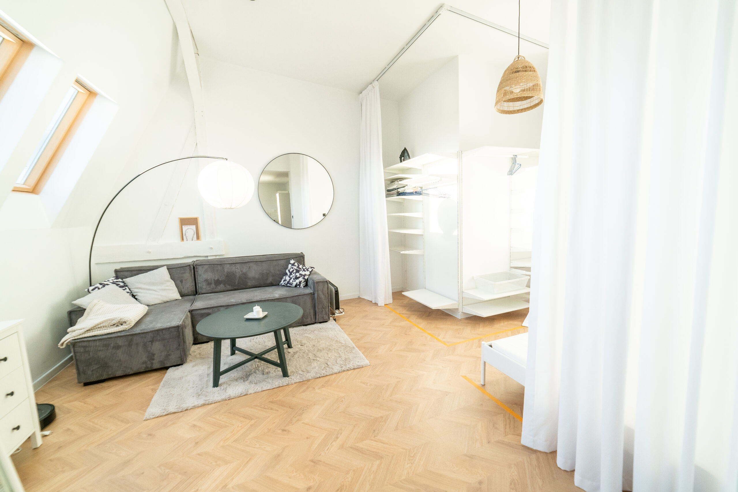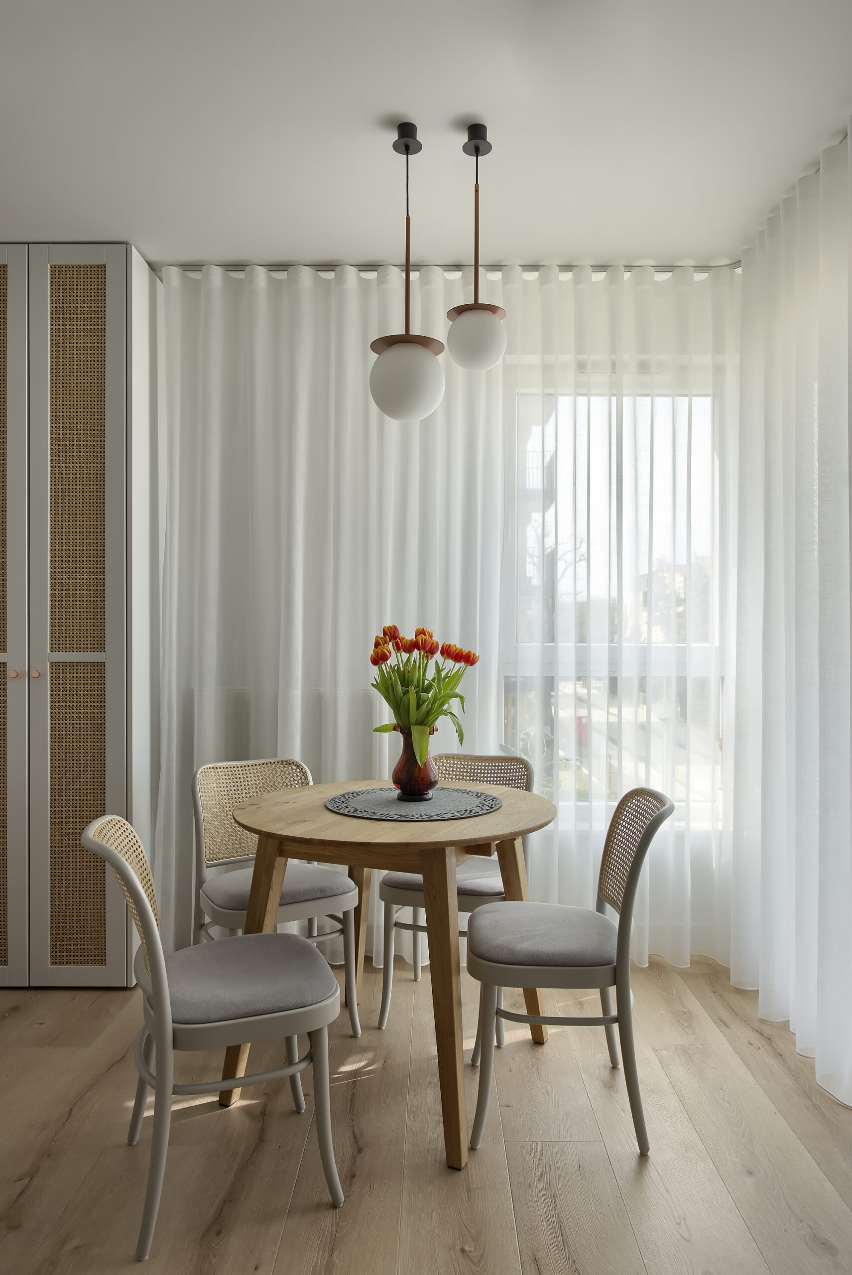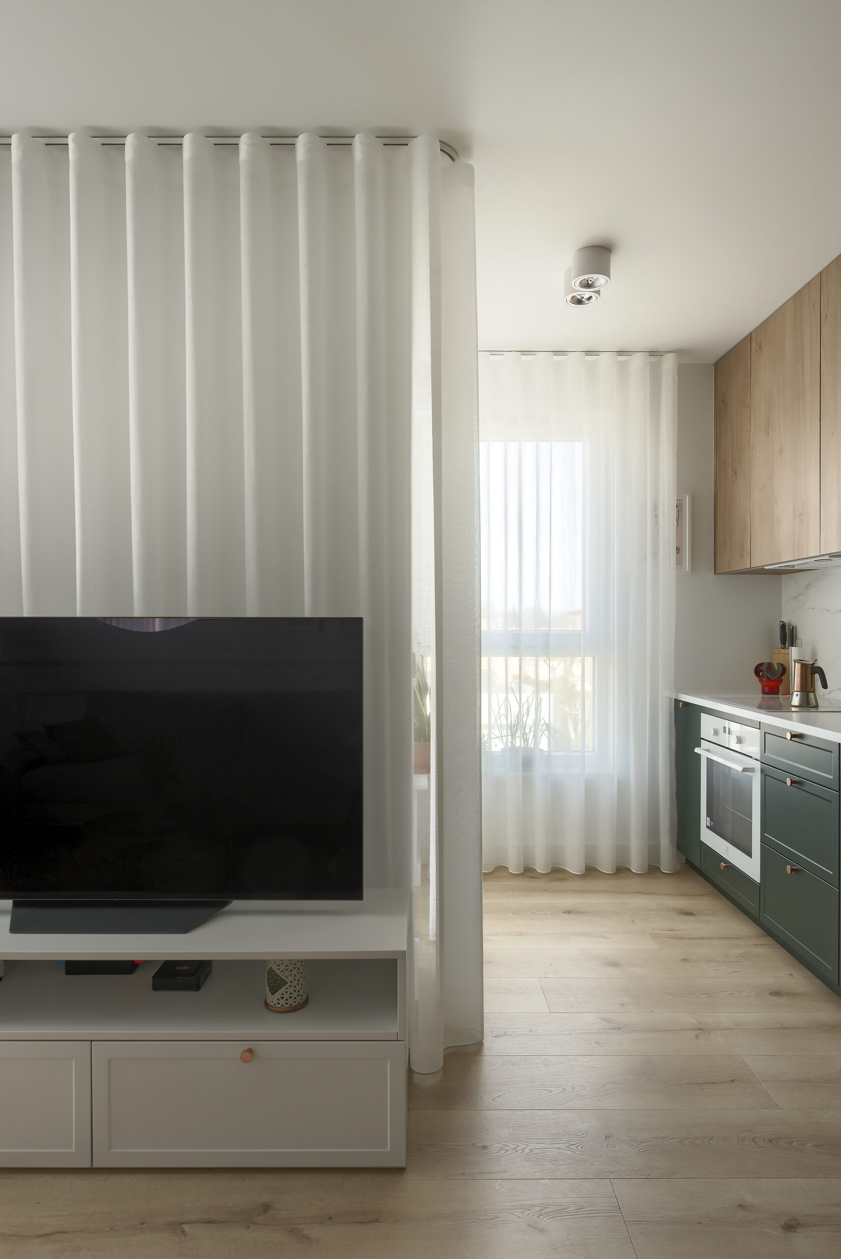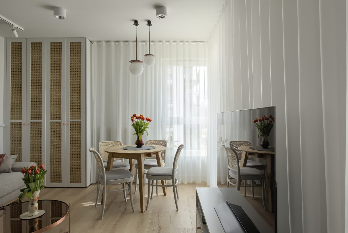 Centralne okno balkonowe zajmuje niemal całą powierzchnię ściany w salonie, tym samym mocno wpływając na klimat pomieszczenia. Nowoczesne firany woalowe do salonu spełniają nie tylko estetyczne preferencje użytkowników, ale również determinują oświetlenie wnętrza. Subtelny salon na ulicy Rejtana nabiera tajemniczości za sprawą światła, wpadającego do pomieszczenia przez lekkie firany woalowe. Beżowe zasłony subtelnie domykają aranżację okna balkonowego, będąc jednocześnie praktycznym elementem zaciemniającym po rozsunięciu na szerokość przeszkleń. Minimalizm zastosowanych elementów, parkiet ze wzorem jodełki i kolory ziemi ze złamaną bielą firan z woalu do salonu w roli głównej to pięknie zrealizowany przepis na modne wnętrze w stylu minimal.