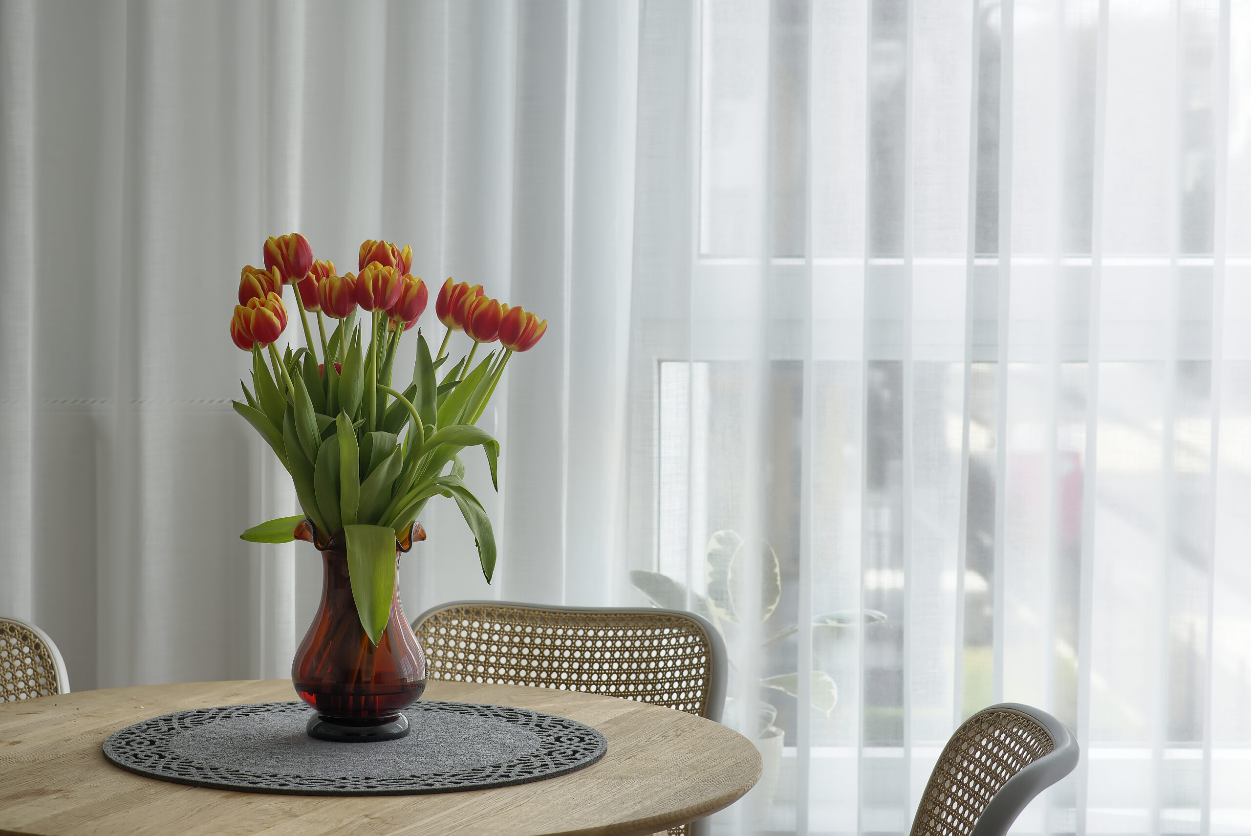 Prezentowane dekoracje okienne salonu wpada w kuszące objęcia minimalizmu. Ten styl ma swoje korzenie w Japonii, gdzie najważniejsza jest harmonia i spokój. Minimalizm to zatem nie tylko sposób aranżacji wnętrz ale również podejście do życia. W obecnych czasach każdy z nas jest przebodźcowany, miło zatem wrócić do domu, który jest wygodny, nowoczesny i uporządkowany. Aby jednak pomieszczenie nie wyglądało zbyt ponuro, aranżacja okien wykorzystuje subtelne materiały, takie jak delikatne firany woalowe do salonu, które nadają wnętrzu miękkości i przytulności. W nowoczesnym wnętrzu królują proste meble, niewielka ilość dekoracji i monochromatyczna paleta barw, ocieplona drewnianym parkietem i lnianymi zasłonami. Dekoracje okien wiszą na karniszu elektrycznym, ukrytym we wnęce sufitowej. Takie rozwiązanie jest zarazem estetyczne i funkcjonalne. Eleganckie firany woalowe za sprawą automatyczne obsługi nie będą tak narażone na zabrudzenia i uszkodzenia, jak przy ich ręcznym zasuwaniu. Wnętrze tego salonu stoi ponad trendami, a biała firana woalowa będzie towarzyszyć właścicielom przez wiele lat.