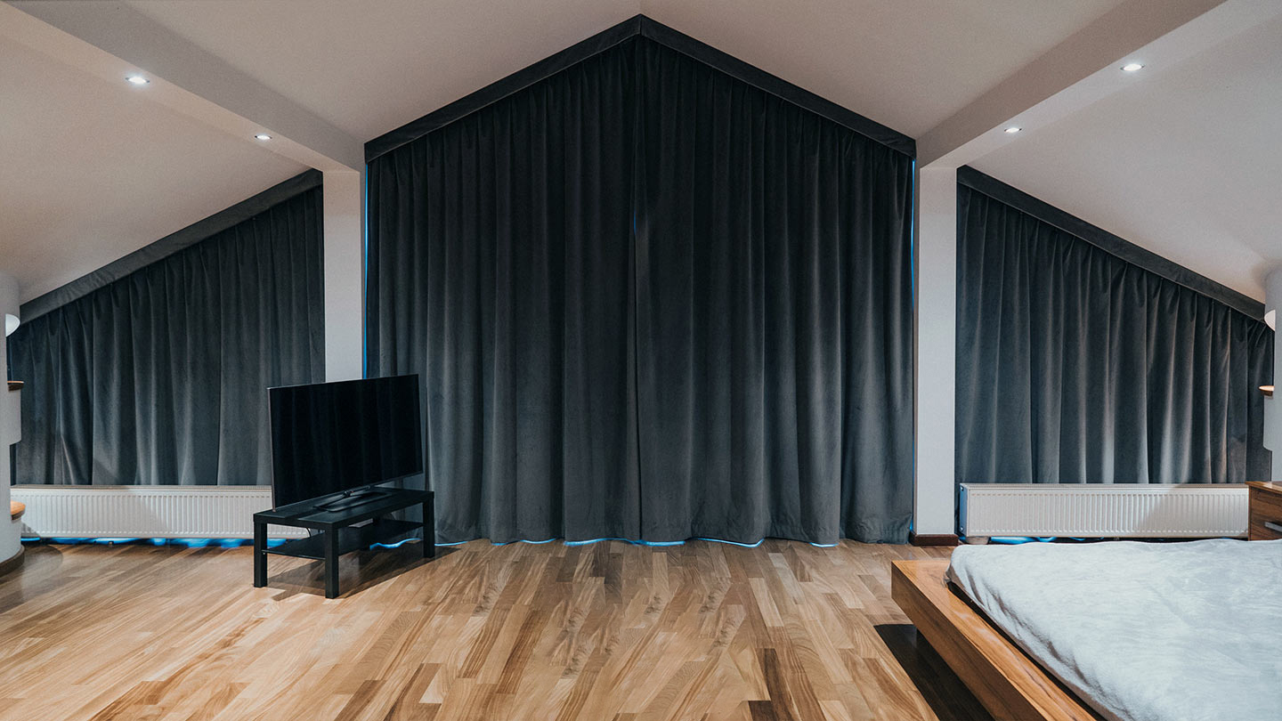 Zasłony na skosach to nowość. Na szczęście jest to też pestka dla naszej firmy, która znana jest z tego, że tworzy wspaniałe rozwiązania na skosy, dzięki którym zasłony się nie zsuwają, a współpracują z inwestorem. Okna ze skosami to rewelacyjny wybór do nowoczesnego domu i sypialni. Nie da się ukryć, że tak duże okno jest w stanie dostarczyć sporej ilości światła. Jednak z drugiej strony trzeba je też jakoś przyciemnić. W tej sypialni od podłogi aż po sufit skośny zastosowano przeszklenie, do którego nasza firma wykonała zasłony przyciemniające. Kolor tkaniny jest ciemny, dzięki czemu znacznie ogranicza on wpływ światła do wnętrza. Całość sterowana jest elektrycznie dzięki zamontowanym na ścianie sterownikom.
