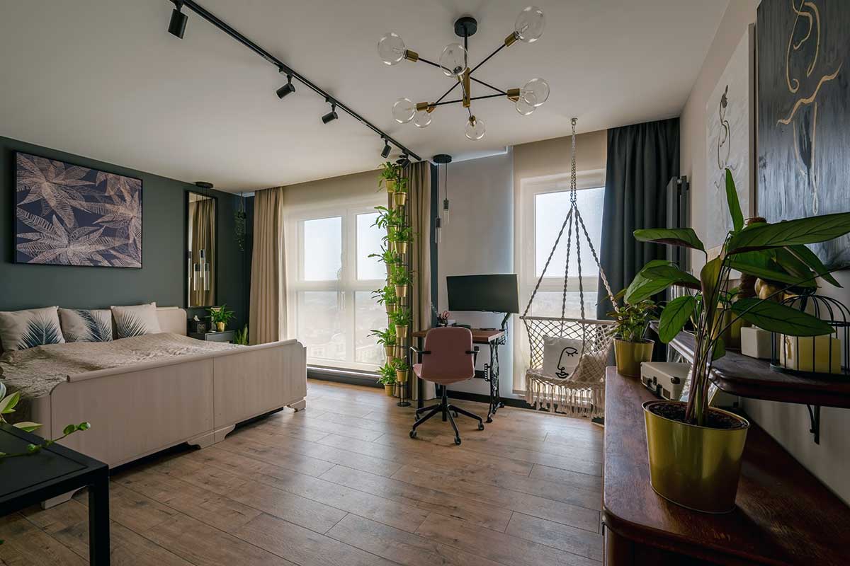 Firany i zasłony to nie jedyne opcje, jeśli chodzi o okno w sypialni. Aranżacje często skupiają się na zainstalowaniu rolet, które skutecznie chronią domowników przed wpadającym światłem czy wścibskim wzrokiem sąsiadów. Właściciele kolejnej sypialni postawili na rolety zwijane elektryczne oraz zasłony na karniszach elektrycznych. Jest to niecodzienna konfiguracja okienna, jednak udało się ją zrealizować z pełnym sukcesem. Zastosowano tutaj zasłony wykonane z tkaniny typu dimout o splocie naturalnym. Zasłona ta bloku aż 80% wpadającego do wnętrza światła. Jeśli opuszczone są również rolety, daje to aż 100% zaciemnienia. Dla wielu osób są to idealne warunki do spania. Struktura użytych tutaj tkanin doskonale komponuje się z nowoczesnymi, naturalistycznymi oraz skandynawskimi dodatkami. Znajdziemy w tej sypialni zarówno sporo roślin, nowoczesnych lamp, złote donice, jak i ręcznie pleciona huśtawkę.