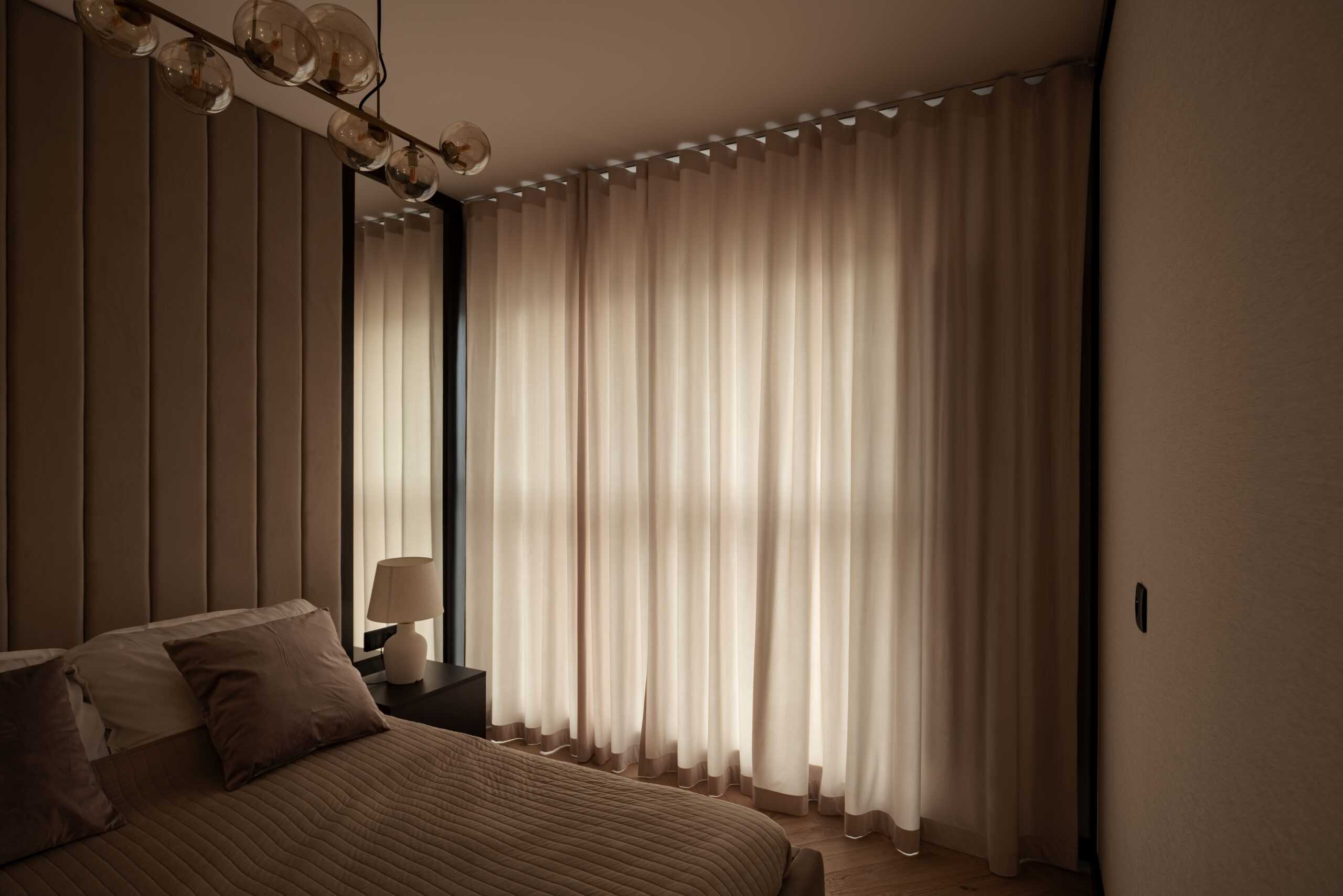 Sypialnia to wyjątkowe miejsce, w którym ludzie szukają ukojenia i prywatności. Odpowiednią dozę intymności mogą zagwarantować zasłony welurowe zaciemniające. Kolejna nasza realizacja to przepiękne wnętrze sypialni urządzonej dość skromnie, choć urozmaiconej tkaninami i tapetami. Na drewnianej podłodze leży ciemny dywan, na ścianie za łóżkiem widnieje abstrakcyjna tapeta, a na oknach wiszą zasłony welurowe zaciemniające. Użyto tutaj dwie warstwy beżowego weluru, który prezentuje się wręcz nieziemsko. W tym pomieszczeniu zasłony zostały zawieszone na fleksach na karniszach elektrycznych. Takie rozwiązanie pozwala na łatwe, szybkie i bezproblemowe odsunięcie i zasunięcie zasłon w dowolnym momencie przy pomocy pilota. Inwestorzy posiadający zainstalowaną aplikację na smartfonie mogą zaprogramować dokładne godziny odsuwania i zasuwania zasłon, według własnych potrzeb. Mimo że okno nie zajmuje całej ściany, zasłony już tak. Dzięki temu można mieć pewność, że przez szpary nie przedostanie się ani jeden promień słońca.